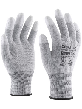 Temel Özellikler: Sentetik eldiven, PU, parmak ucu kaplamalı, 13 gg, karbon fiber – polyester, Cat. II, gri, arka kısmı ve avuç içi nefes alabilir, Anti-Statik / ESD, hassas işçilik için.